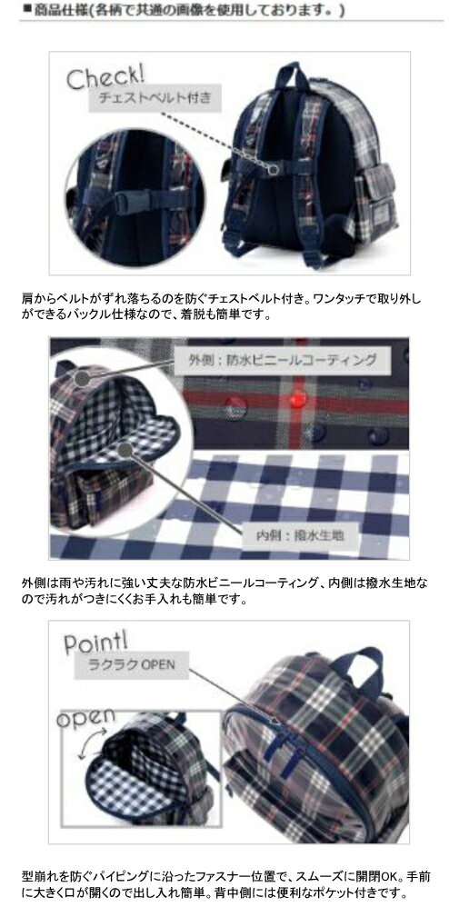 ■商品の特長■肩ベルトがずれないチェストベルト付きチェストベルト付きなので、肩からベルトがずれ落ちることがなく、小さな子どもでも安心して背負えます。