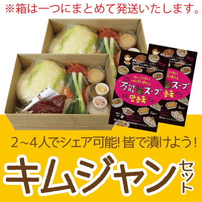 ご自宅で簡単に漬けられる「自分で漬けよう手作りキムチセット」×2つと、韓国料理を簡単にしてくれる「万能ソルロンスープの素」×2袋を一緒にお届けいたします。
