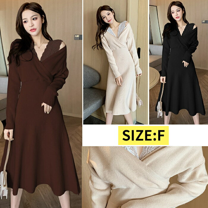 ニットワンピース 秋冬 レディース 無地 ワンピース レディース カシュクール Vネック レースインナー 長袖 ロング丈 着痩せ 大きいサイズ ゆったり 柔らかい あたたかい お呼ばれ 二次会 冬服 カジュアル ファッション 綺麗 オシャレ