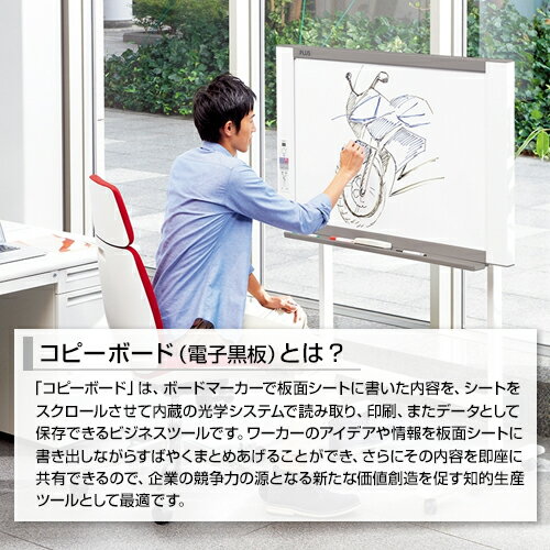 重量21.0kg(本体・T字脚のみ) ■ボード本体■■詳細■ ボード面寸法幅900×高さ600mm 読取有効寸法幅880×高さ590mm ボード面数2面 ページ送り一方向エンドレス(横スクロール) 駆動方式シート移動式 読取方式CIS(Contact Image Sensor)※CISの特徴=読み取り装置が小さく薄型、USB端子から電源を取れる、ウォームアップ時間が不要 読取照明光源RGB LED 読取解像度主走査方向(ボード面=縦) 3.84dots/mm(100dpi相当)副走査方向(ボード面=横) 1.92dots/mm(50dpi相当)※マーカー色および描画色によっては、正しい色調として読取れない場合があります。
