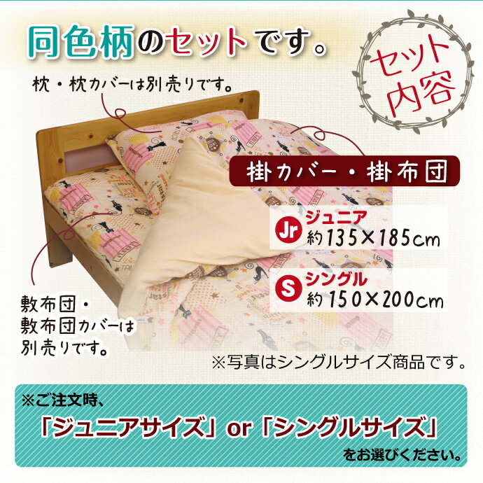 規格 size:シングル【掛カバー】150x200cm 【掛布団】150x200cm ジュニア【掛カバー】135x185cm 【掛布団】135x185cm 素材:【表面】綿100%【裏面】パイル部分:綿100% グランド部分:ポリエステル100%布団:生地:ポリエステル80%綿20% 中綿:ポリエステル100% ※サイズは全て外寸になります。